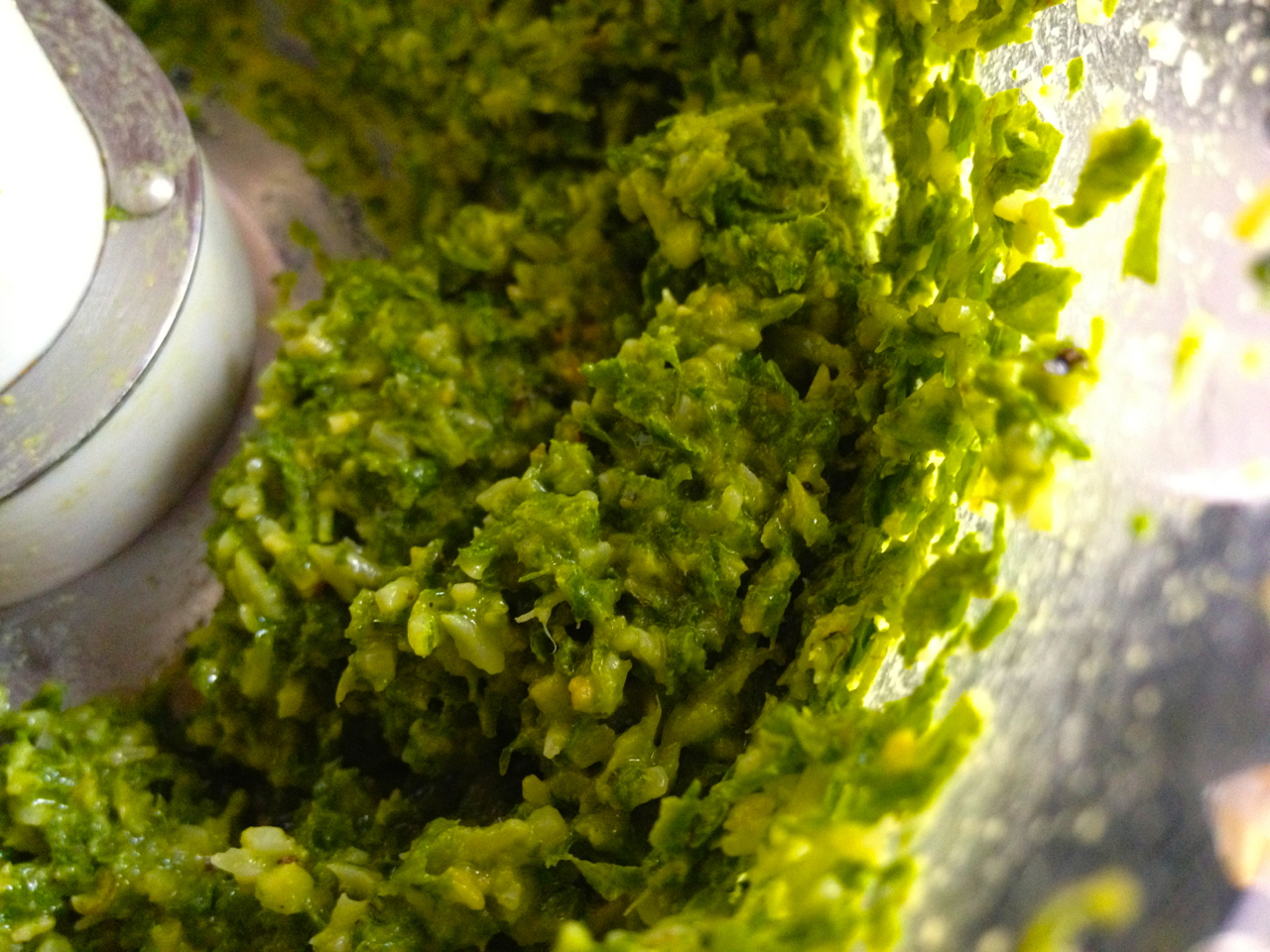 You want to keep an eye on this step. Too much EVOO and you wind up with really runny Pesto, which...if you like it that way, go for it. I prefer a dryer Pesto so I add just enough to incorporate the ingredients.